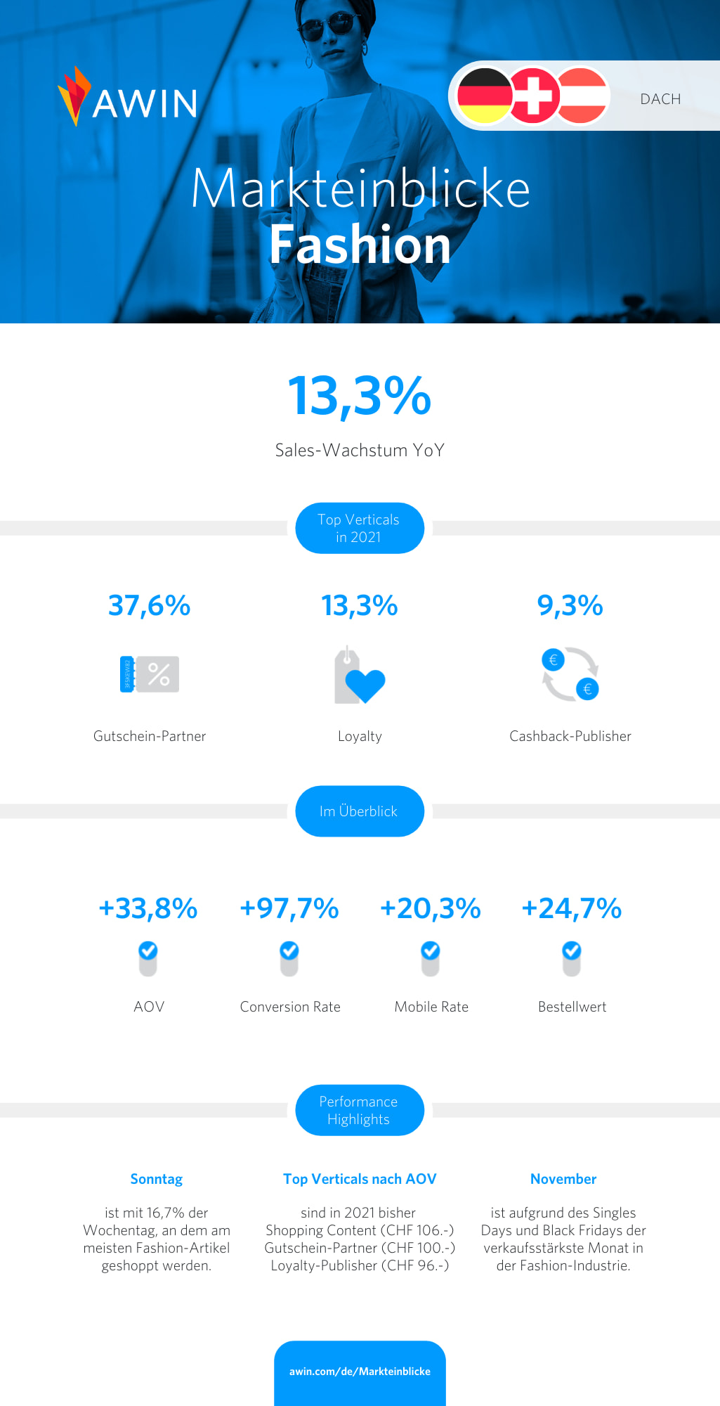 Daher ist es nicht erstaunlich, dass wir in den vergangenen Wochen, seit ungefähr Ende März, einen leichten Anstieg in der Sales-Kurve und einen starken Anstieg beim AOV verzeichneten. Was uns die Zahlen aus dem bisherigen Jahr 2021 noch verraten und was Awin Advertiser und Publisher über die Entwicklung der Fashion-Industrie zu sagen haben, erfährst Du in diesem Artikel. Ausserdem findest Du in unserer Infografik weiter unten ein paar spannende Markteinblicke zur Fashion-Branche.