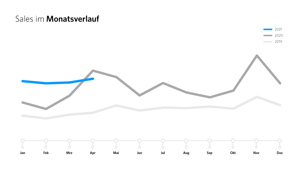 Entgegen der Erwartung, dass Sportartikel vor allem zum Jahresanfang gekauft werden, zeigt die Sales-Kurve der vergangenen zwei Jahre, dass in den Monaten Januar und Februar die wenigsten Sales generiert wurden. Während die Sales 2019 noch über das Jahr hinweg sehr konstant verliefen, äußerte sich die Schließung der Filialen und Sporteinrichtungen im Frühjahr 2020 in einem Online-Sales-Anstieg von 181% im April im Jahresvergleich.