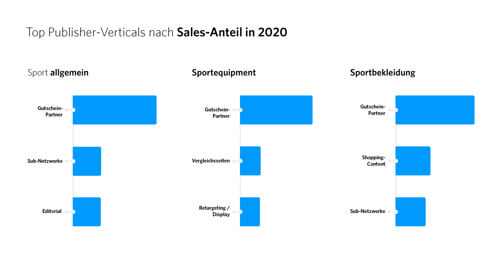 Unseren Daten nach nimmt der Sales-Anteil von Gutschein-Partnern im Jahresvergleich von 2019 zu 2020 vor allem im Segment Sportequipment jedoch nach und nach ab. Dafür generieren verstärkt Vergleichsseiten sowie Retargeting / Display Publisher Sales.