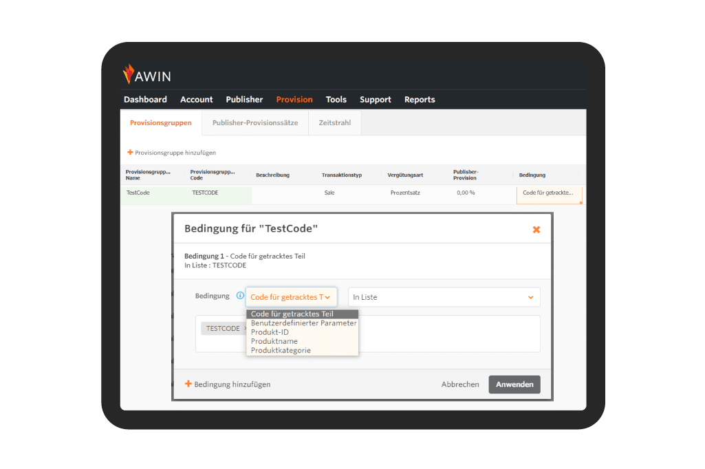 Wenn Du bereits zusätzliche Datenpunkte an Awin übermittelst (Custom Parameter) kannst Du nun für diese Parameter Provisionen festlegen und somit flexibel gestalten. - Provision nach Produktkategorie