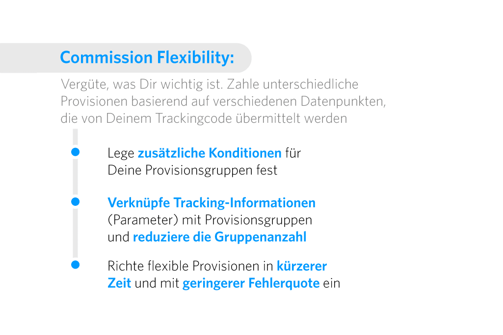 Commission Flexibility ist eine Funktion des Provisionsmanagers mit der Advertiser zusätzliche Kriterien für ihre Provisionsgruppen festlegen können. So wird eine flexiblere und individuellere Provisionsgestaltung entsprechend der Programmziele ermöglicht.