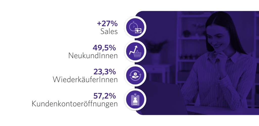 Die Implementierung personalisierter Produktempfehlungen führte zu einer beeindruckenden Sales-Steigerung von 27%, wovon fast die Hälfte der KäuferInnen NeukundInnen waren. Darüber hinaus zeigte sich, dass 23,3% der gewonnenen NeukundInnen wiederholt bei for you eHealth einkauften und 57,2% von ihnen ein Kundenkonto eröffneten.