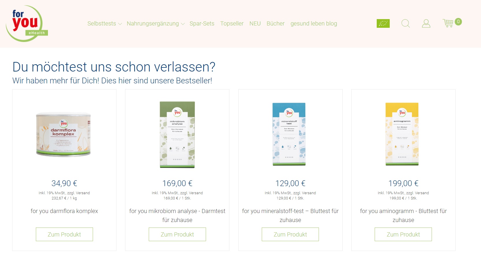 Die for you eHealth GmbH ist ein deutscher Online-Shop, der sich auf den Verkauf von Produkten zur Verbesserung der Gesundheit spezialisiert hat. Ihr Produktsortiment umfasst Online-Selbsttests, Nahrungsergänzungsmittel und Gesundheitscoachings zur Optimierung von Gesundheitswerten auf Basis persönlicher Biomarker. Alle Produkte werden nach IFS-Standard in Deutschland hergestellt und die Selbsttests von renommierten Laboren analysiert. Ein erfahrenes Team von Ernährungs- und SportwissenschaftlerInnen unterstützt die KundInnen bei der Umsetzung ihrer individuellen Gesundheitsziele.