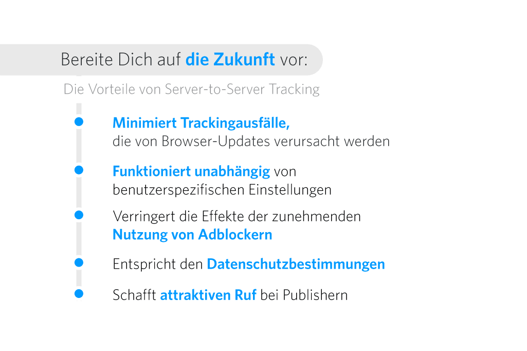 Die technischen Entwicklungen für höhere Datenschutzstandards und Verbraucherschutz werden sich nicht verlangsamen oder aufhören. Serverseitiges Tracking ist das Online-Tracking der Zukunft. Wir empfehlen, das Tracking so anzupassen, dass es den zunehmenden Einschränkungen und Änderungen der Browser standhält.