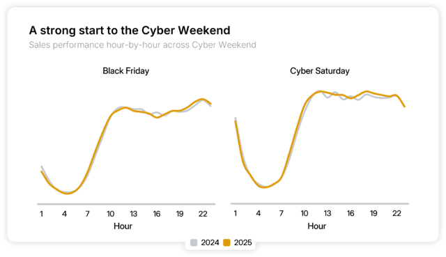 Dann wurde es ruhiger. Am Sonntag waren die Sales am Morgen zunächst relativ stabil, bevor sie später jedoch abflauten. Bis zum Cyber Monday vergrößerten sich die Unterschiede zwischen 2024 und 2025 zunehmend, besonders rund um die gewöhnlichen Spitzen-Shoppingzeiten wie 21:00 Uhr.