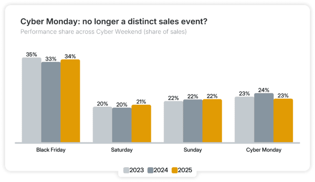 Hatte sich das Ende des Cyber Monday schon länger angekündigt? Nicht unbedingt. Tatsächlich stieg der Anteil der Sales über das Wochenende hinweg (Black Friday bis Cyber Monday) im Jahresvergleich von 23,2 % auf 24,2 %. Mit 22,6 % für 2025 liegt er knapp vor dem Sonntag (22,4 %) – das PR-Team überlegt sich dafür wahrscheinlich schon einen neuen Namen. (Spar-Sonntag, vielleicht?)
