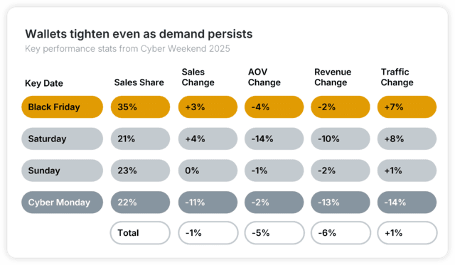 Trotz positiver Traffic-Entwicklung fielen sowohl der Umsatz als auch der durchschnittliche Warenkorbwert (AOV) über das gesamte Cyber Weekend hinweg.