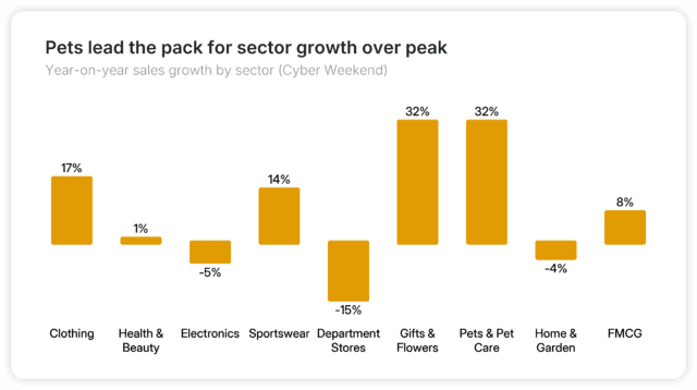 Der Bereich Haustiere und Haustierpflege war im November besonders stark und erzielte ein Sales-Plus von 22 % im Jahresvergleich. Die eigentliche Spitzenperformance zeigte sich jedoch am Cyber Weekend: +32 % Wachstum – ein Wert, der mit etablierten Peak-Season-Kategorien wie Geschenke und Blumen (+32 %), Sportbekleidung (+14 %) und Kleidung (+17 %) vergleichbar ist und diese teilweise sogar übertroffen hat.