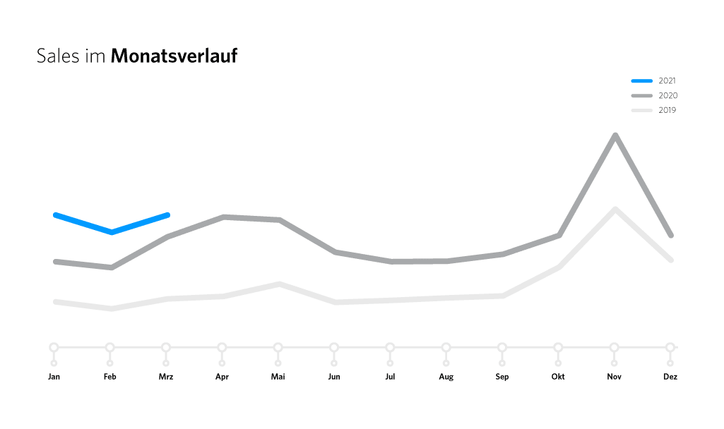 Betrachtet man die monatlichen Sales im Jahresverlauf, wird die typische Corona-Pandemie-Kurve deutlich, bei der es im ersten Lockdown von März bis Mai 2020 und zum Black Friday eindeutige Sales-Peaks gibt. Doch der allgemeine und vor allem konstante durchschnittliche Sales-Anstieg von 53% in 2020 verglichen mit dem Vorjahr lässt darauf schließen, dass die Health & Beauty Industrie beim Online-Shopping generell an Relevanz gewinnt und mehr und mehr Produkte online gekauft werden – unabhängig von den Lockdowns.