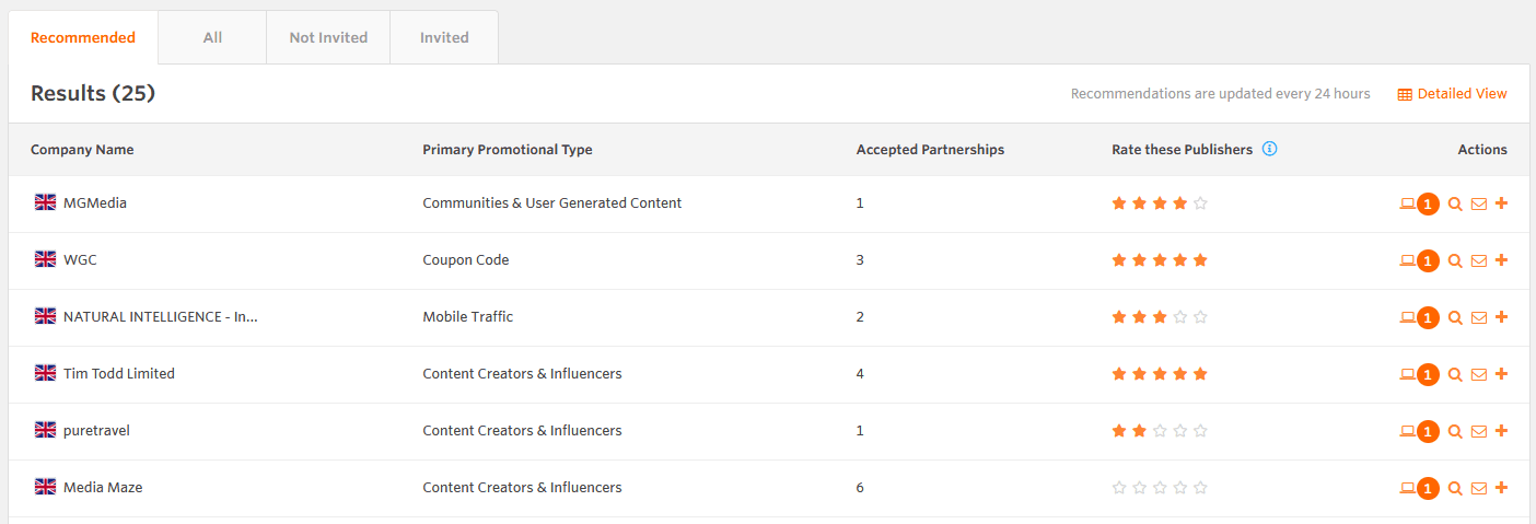 Awin hat einen Algorithmus entwickelt, der Dir Publisher empfiehlt, die unserer Meinung nach gut zu Deiner Marke passen. Der Report generiert automatisch bis zu 25 PartnerInnen pro Tag, die Du unter der Rubrik "Recommended" im Publisher-Verzeichnis findest.