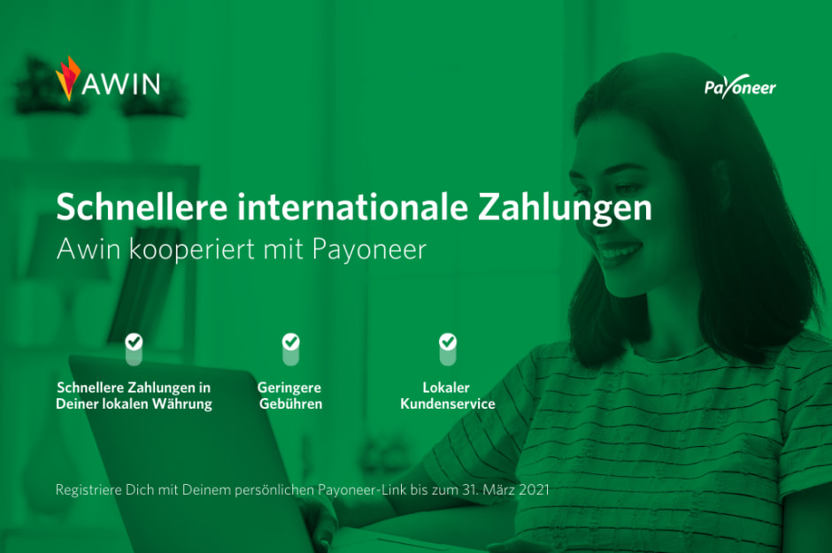- Wenn Du internationale Zahlungen (als International Wire Transfer (IWT)) als (D)eine Zahlungsmethode ausgewählt hast, erhältst Du eine E-Mail von Awin mit einem eindeutigen Registrierungslink, über den Du Dich bis zum März 2021 bei Payoneer registrieren musst. Falls Dein Registrierungslink abhandengekommen ist oder Du keinen erhalten hast, kontaktiere uns bitte über das Kontaktformular.
