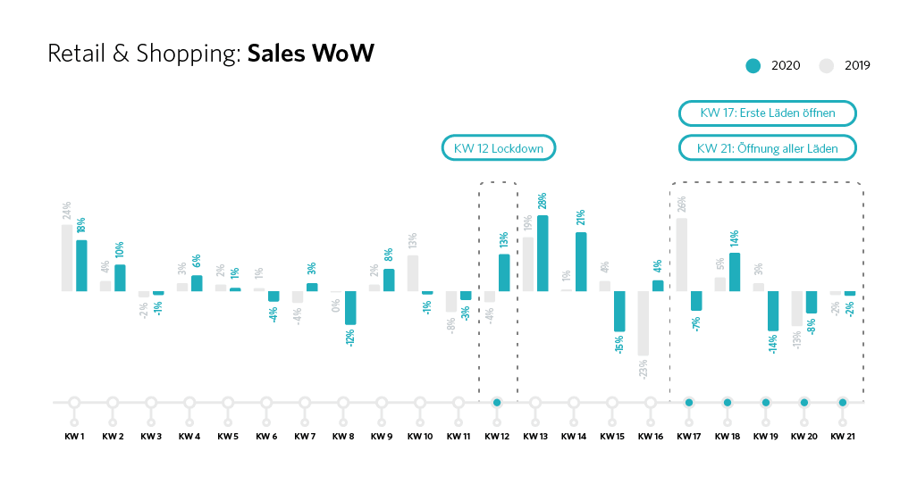 In der Retail-Branche ist der Einfluss des Lockdowns in KW12 auf die Sales deutlich erkennbar, denn allein in dieser Woche kam es zu einem Sales-Anstieg von 13 Prozent im Vergleich zu KW11. Zu dieser Zeit begann das Hamstern von Toilettenpapier, Nudeln und weiteren Lebensmitteln sowie Hygieneprodukten. Aber auch Spiele und Puzzle für die Zeit Zuhause wurden fleißig online bestellt. Der Peak wurde in der darauffolgenden Woche (KW13) erreicht, in der sich die Sales im Wochenvergleich nochmals um 26 Prozent erhöhten. Zwei Wochen später hatten die Verbraucher dann scheinbar ihre Vorräte zur Genüge aufgestockt, denn die Zahlen verzeichneten -15 Prozent Sales verglichen mit der vorhergehenden Woche. Mit den Lockerungen und ersten Wiedereröffnungen der Geschäfte in KW17 sehen wir zudem, dass die Sales im Wochenvergleich weiterhin abnahmen. Dies ist darauf zurückzuführen, dass wieder mehr Menschen in die Geschäfte gingen und vor Ort einkauften, als Online-Käufe zu tätigen. Mit der deutschlandweiten Öffnung der Stores in KW21 sehen wir gleichzeitig auch einen Rückgang der Sales in der Retail-Branche, was damit zu tun haben könnte, dass die Lockerungen ein erstes beruhigendes Zeichen für die Verbraucher waren und diese in ihrem Shoppingverhalten ein Stück zurück zur Normalität gingen.