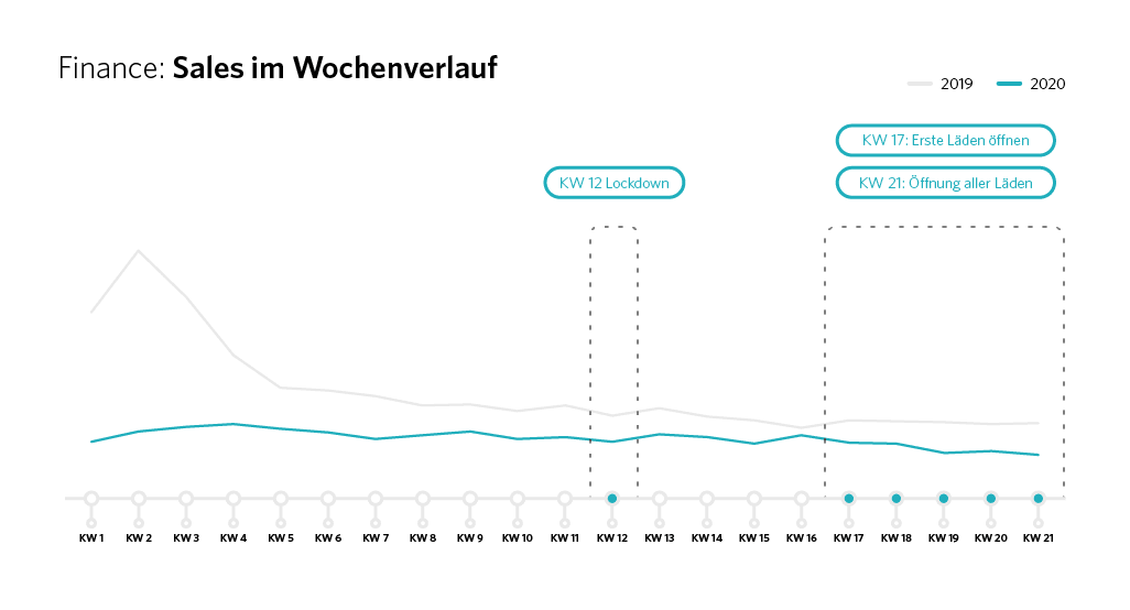 Schon zu Beginn der Pandemie in KW4 konnten wir die stetigen Sales-Abnahmen (-14 Prozent im Vergleich zu Vorwoche) beobachten. Mit dem Lockdown in KW12 ging es dann drastisch bergab: Bereits in KW11 wurden -43 Prozent Sales im Vergleich zu KW10 verzeichnet. In KW 12 waren es dann -63 Prozent Sales im Vergleich zu KW11 und schließlich -51 Prozent Sales in KW13 verglichen mit KW12.