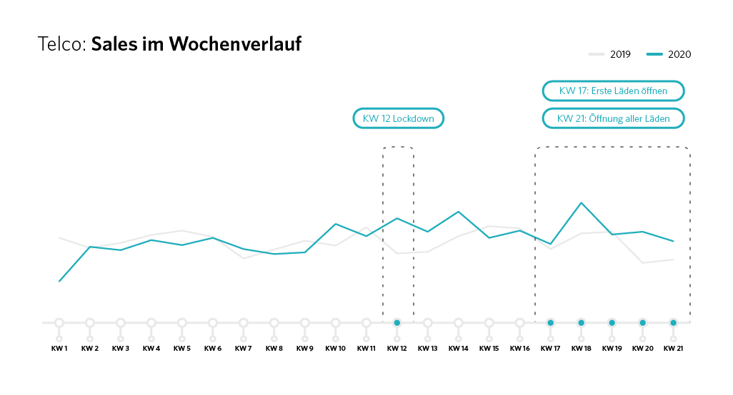 Erstaunt waren wir, als wir einen Blick auf die Daten von Telco & Services geworfen haben. Denn die Sales-Zahlen verzeichneten im Wochenvergleich keine besonderen Anstiege oder Abnahmen. Dabei lag die Vermutung nahe, dass gerade während des Lockdowns viele Arbeitnehmer aufgrund des Homeoffices neue Internet- und Telefonverträge mit besseren Konditionen oder einem höheren Datenvolumen abschließen würden. Doch bis auf ein paar Ausnahmen ist die Anzahl der Sales im Wochenvergleich ähnlich wie im vergangenen Jahr. Nur in der zweiten Woche (KW 18) nach den ersten Wiedereröffnungen kam es zu einem Sales-Anstieg von 29 Prozent im Vergleich zur vorherigen Woche.