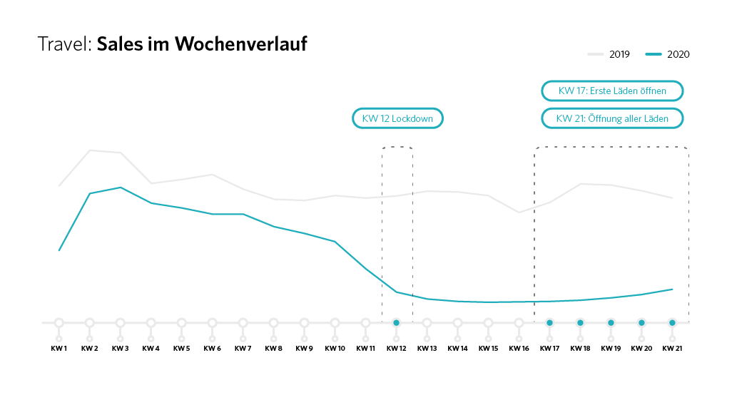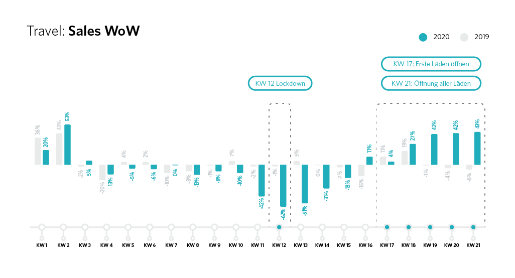 Mit der Wiedereröffnung der Geschäfte und den ersten Lockerungen schienen aber zumindest die ersten Reiselustigen wieder zu hoffen, dass dieses Jahr doch noch Urlaub außerhalb der eigenen vier Wände möglich ist. Denn schon in KW16 stiegen die Sales um 11 Prozent verglichen mit der Woche zuvor. Seit KW18 nahmen die Sales dann auch wieder stetig zu. So gab es in dieser Woche einen Sales-Anstieg von 26 Prozent im Vergleich zu KW17, einen Anstieg von 43 Prozent in KW 19 verglichen zu KW18 und schließlich +47 Prozent in KW21 - der Woche, in der deutschlandweit wieder Geschäfte öffneten.