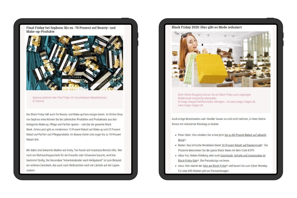 Am meisten helfen uns Deal-Listen, rechtzeitige Hinweise zu stark nachgefragten Produkten und Kategorien zu Beginn der Cyber Week und während des Black Fridays. So können wir die Redaktion frühzeitig briefen und der Output der Kampagne optimiert werden. Zudem sollte uns der Advertiser Auffälligkeiten in den Sales zügig mitteilen. Wenn ihm beispielsweise auffällt, dass vor allem Smartphones gut laufen, dann kann er uns die Top 3 Bestseller auf kurzem Dienstweg schicken. Wir sind agil, schnell und können auch ausverkaufte Produkte innerhalb von Minuten in den Artikeln ersetzen.