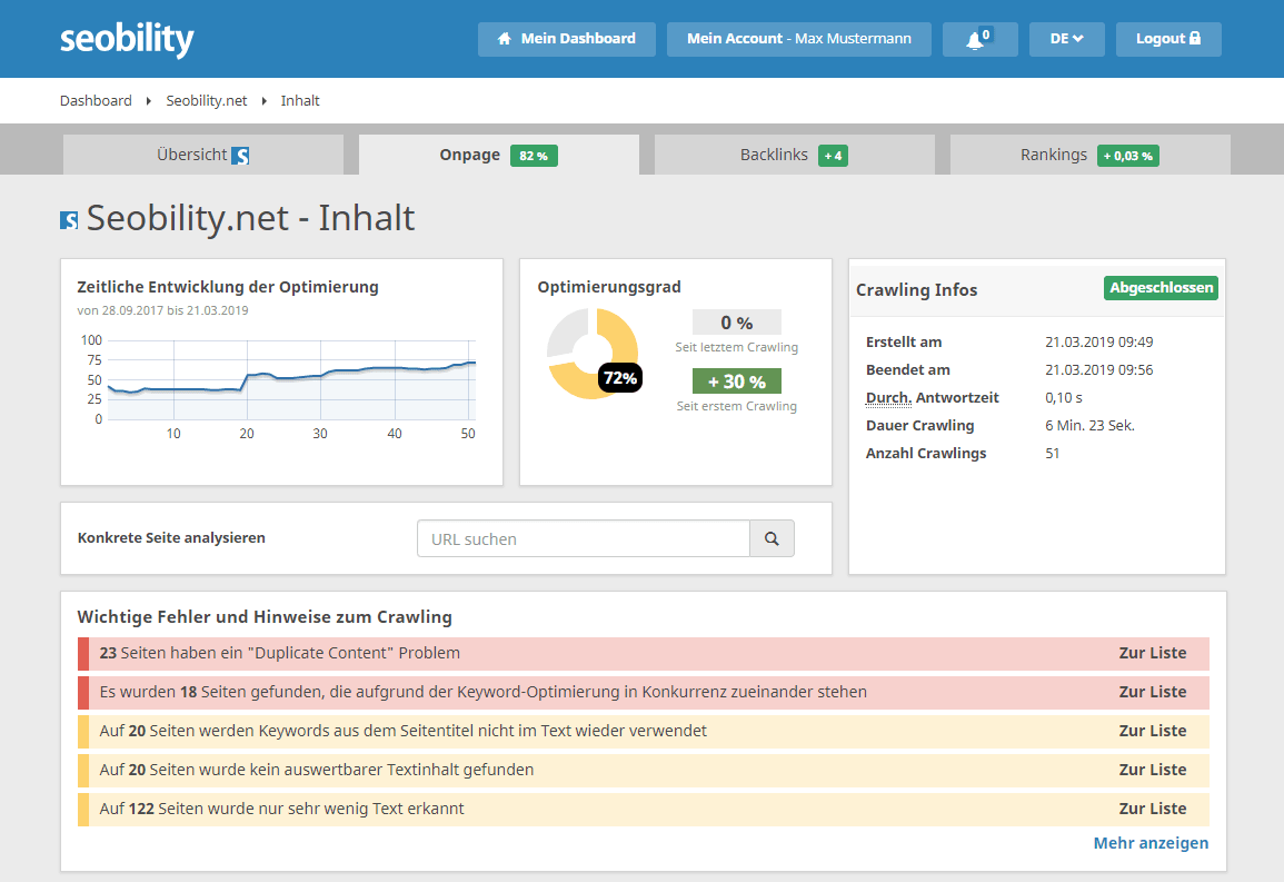 Die Onpage-Optimierung ist hierbei eine der wichtigsten Aufgaben und kann das Ranking Deiner Seite enorm verbessern. Nur wenn Deine Website technisch einwandfrei läuft und relevante Inhalte problemlos gecrawlt werden können, kann Google Deine Seiten korrekt indexieren und bei passenden Suchanfragen als Ergebnis ausliefern. Das Onpage SEO-Tool Seobility unterstützt Dich bei dieser Aufgabe, indem es Deine komplette Website analysiert und auf technische Fehler, Probleme und Verbesserungspotenziale untersucht.