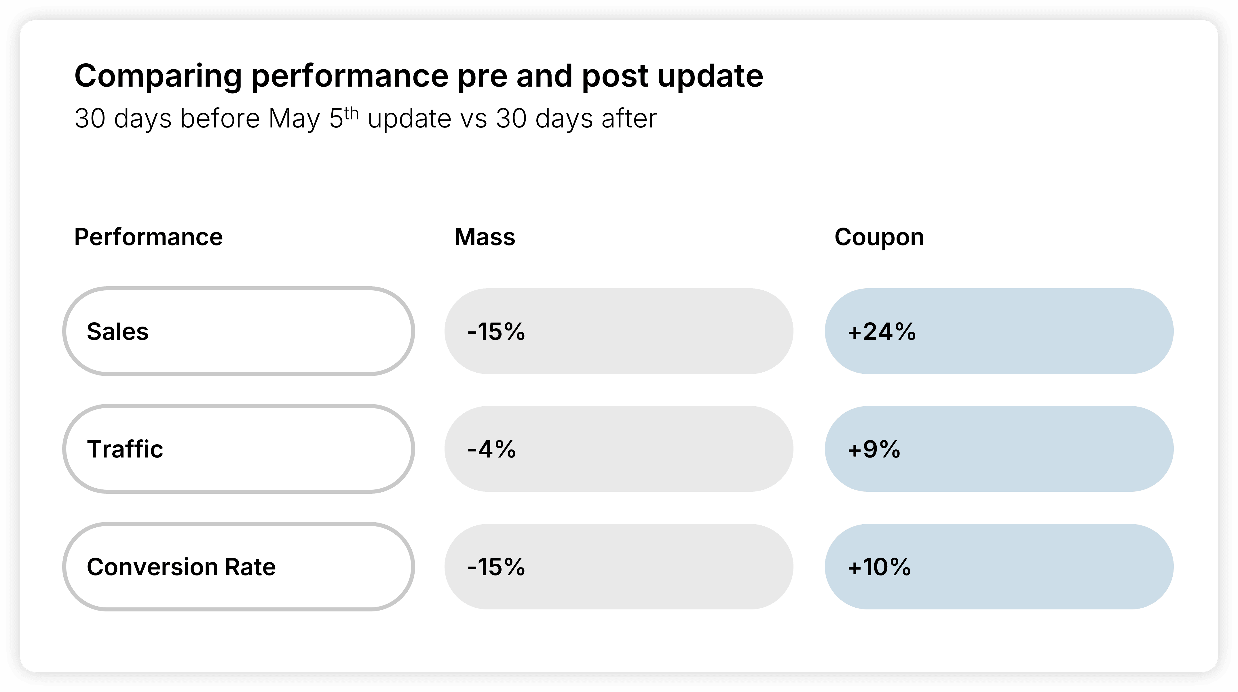 Primero, observamos algunos resultados de rendimiento base. Comparando el rendimiento de 30 días antes de la actualización vs. 30 días después, podemos ver inmediatamente un impacto enormemente contrastante en las ventas para los afiliados de medios masivos (-15%) y los sitios estándar de cupones (+24%).