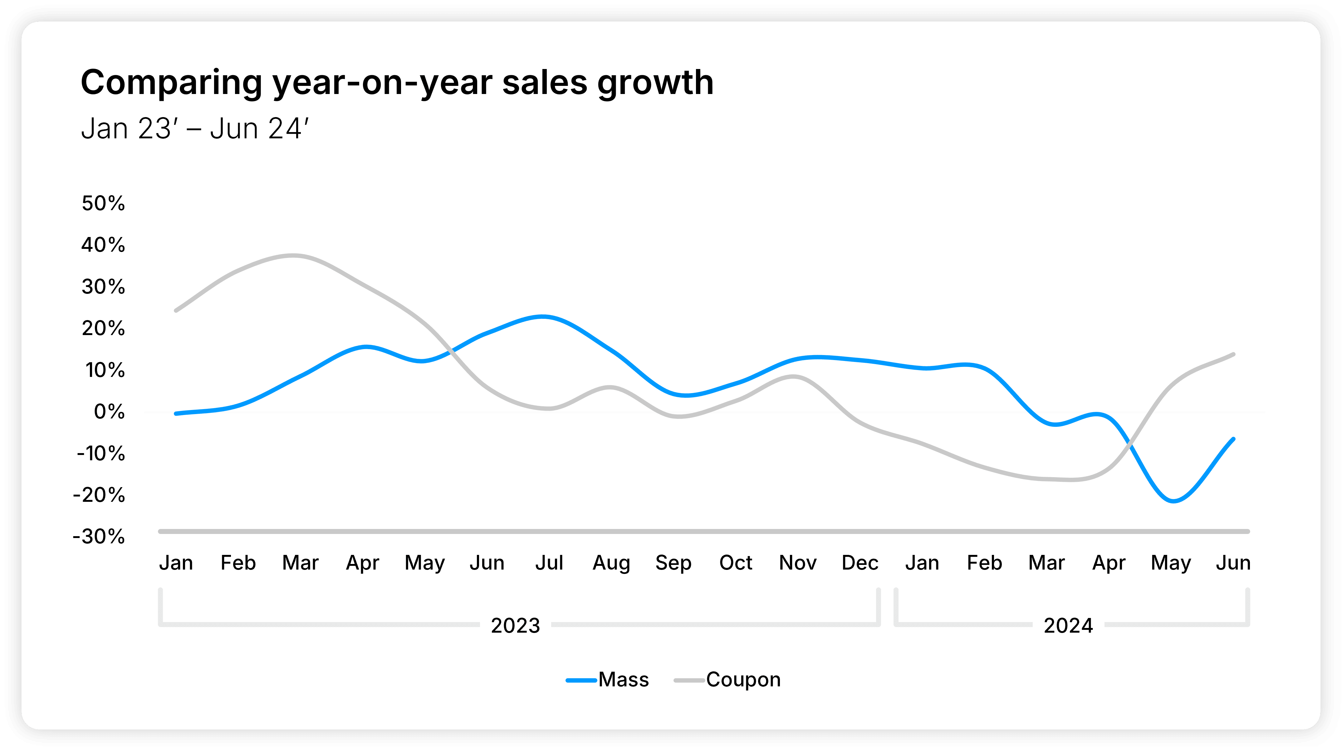 Desde abril de 2022, los sitios de cupones estándar han mantenido un CVR saludable del 9-12%, muy por encima del 3-4% de los medios de comunicación de masas, mucho más bajo aunque más constante, durante el mismo período. Los primeros incluso han contrarrestado los descensos de todo el sector aumentando su CVR en un 53% entre enero de 2022 y junio de 2024 en medio de un clima económico inestable. Por el contrario, el CVR de los medios de comunicación de masas ha caído un 25% durante el mismo periodo.