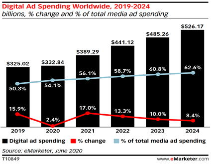 Observando el panorama global, la empresa de estudios estima que el gasto total en publicidad disminuirá en casi un 5% en 2020. Mientras que el digital seguirá creciendo -moderadamente- en un 2,4%, esto es significativamente inferior a sus predicciones pre-pandémicas.