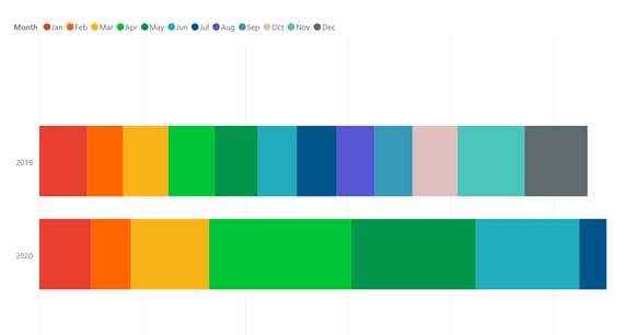 Consideremos a los retailers de hogar y el jardín en el Reino Unido. Las ventas de Awin a principios de julio superan a las de todo el año 2019, como se ve en esta comparación desglosada de ventas mensuales del sector: