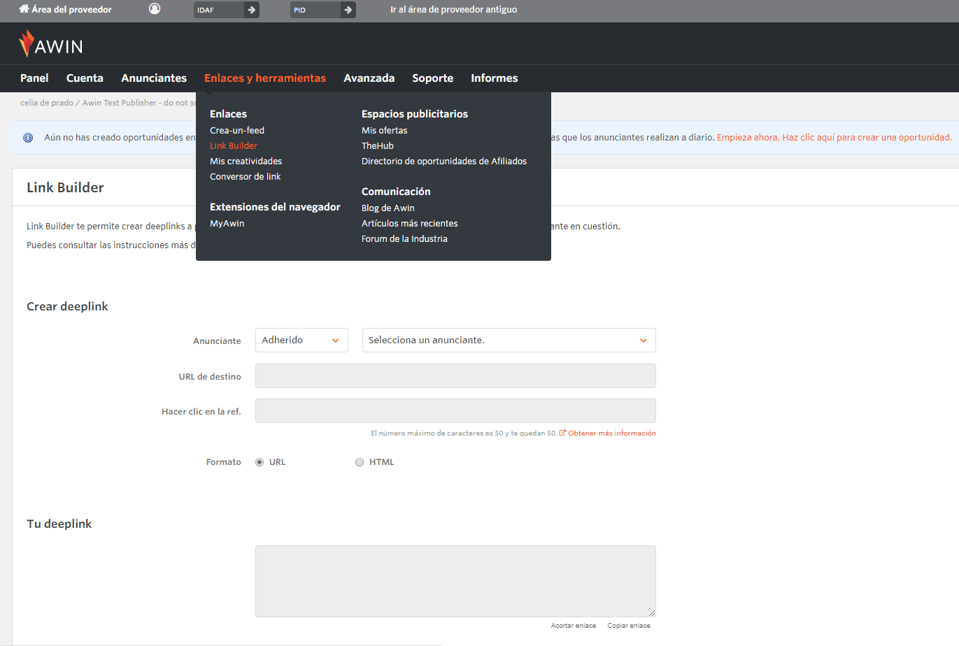 Para llegar a la herramienta de Link Builder el Publisher tiene que meterse en nuestra plataforma, ir a Enlaces y herramientas > Link Builder.