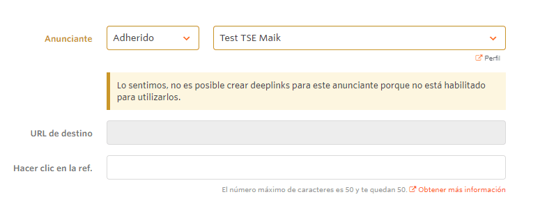 PASO 2: El Publisher selecciona el programa en el que quiere crear un deeplink (Ejemplo: Test CPM ES). Si no te permite crear un deeplink en un programa te saldrá un mensaje de advertencia, aunque el anunciante esté en la lista de programas, no permiten crear deeplinks.