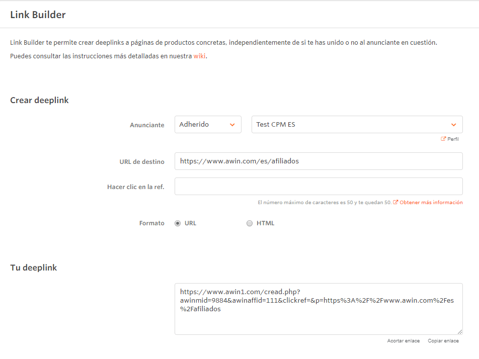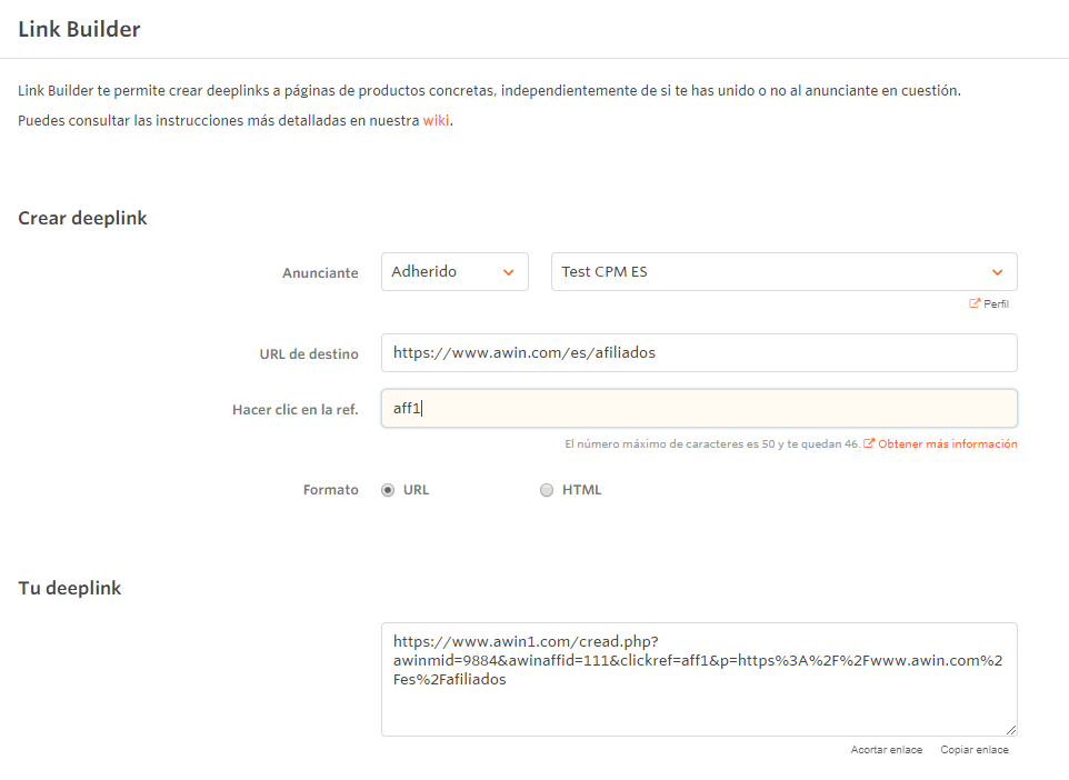 Es importante que sepas que el deeplink, que debes integrar en tu web, es el que te devuelve el Link Builder en el apartado de Tu Deeplink. Lo puedes coger en formato URL o HTML. Esta url viene codificada y no se puede modificar ninguna parte, se debe copiar tal cual.