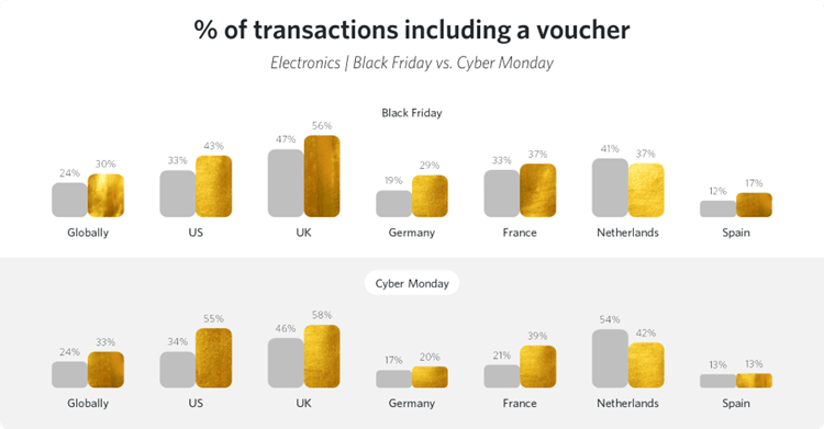 Durante el Black Friday en el sector minorista, la tasa de transacciones con un código pasó del 33% al 36% anual. Un tercio de las ventas mundiales de electrónica de este año incluyeron un vale, lo que supone un aumento respecto al 28% de 2022, mientras que el sector de la moda se mantuvo estable en una tasa del 27%. Los grandes almacenes, una industria que ha estado luchando en medio de las recientes presiones económicas, también trataron de atraer a los consumidores a gastar mediante el aumento de su uso de descuentos, saltando del 6% al 15% en 2023.