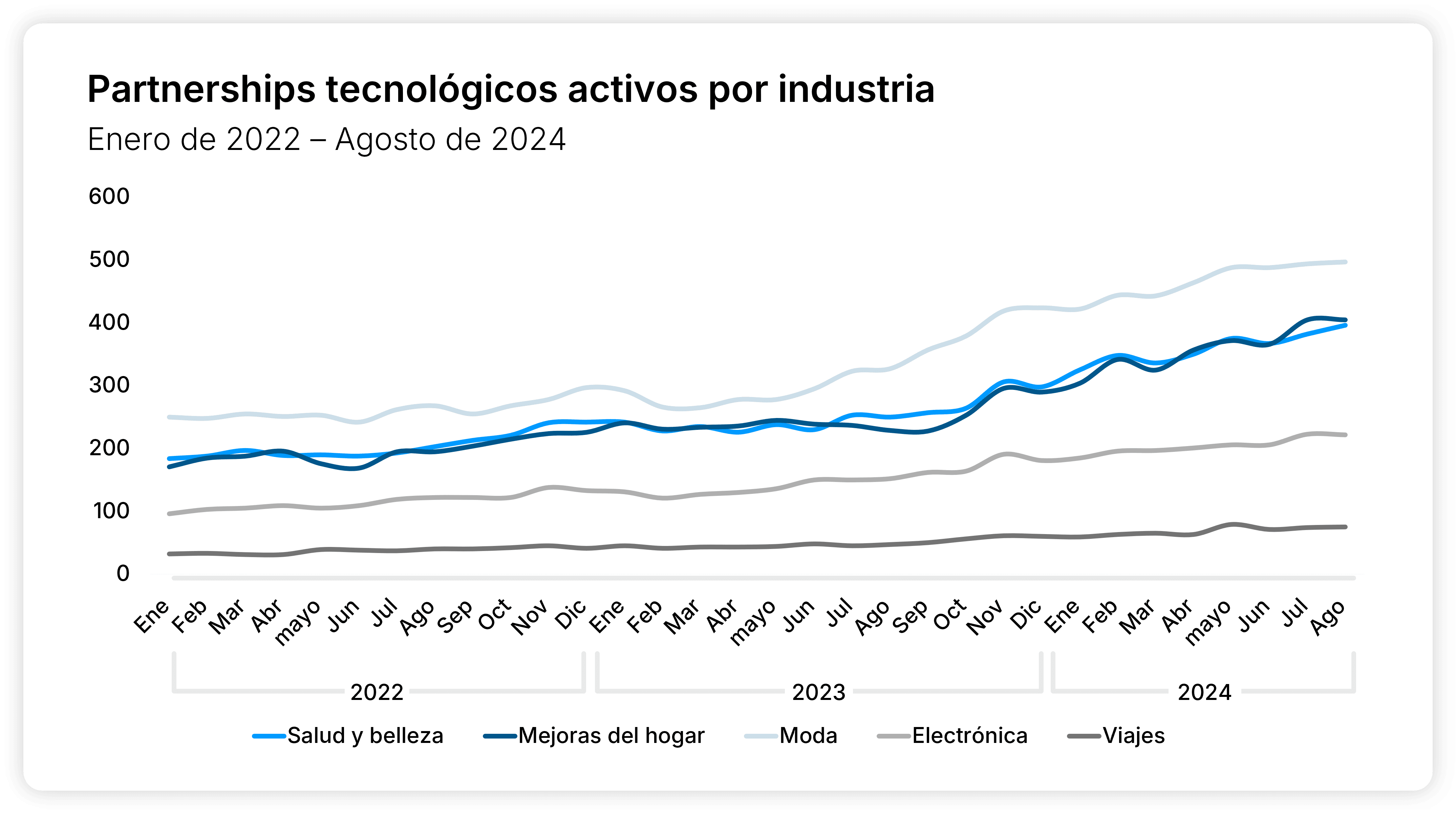 Los sectores de Mejoras para el Hogar (405) y Salud y Belleza (396) también registran un aumento constante de partners tecnológicos, pero su incorporación ha sido mucho más lenta en los sectores de Electrónica (222) y Viajes (75), sin signos de un cambio inmediato.