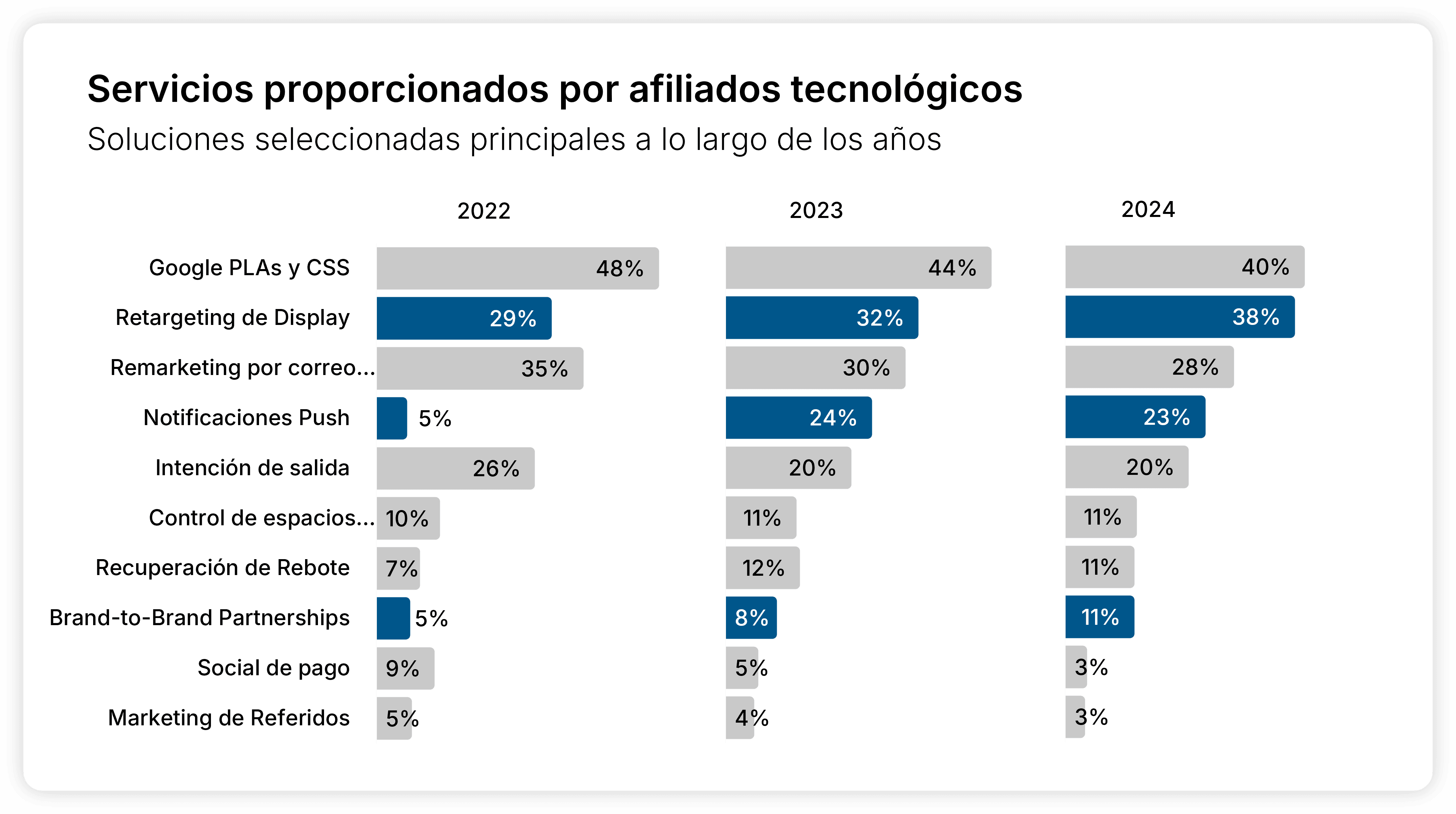 Por ejemplo, el 38% de los partners tecnológicos ofrece ahora retargeting de Display, que ha crecido un 31% desde 2022. Las notificaciones automáticas "push" y las Brand Partnerships también son áreas de gran crecimiento, con aumentos del 360% y el 120%, respectivamente, en el mismo periodo.