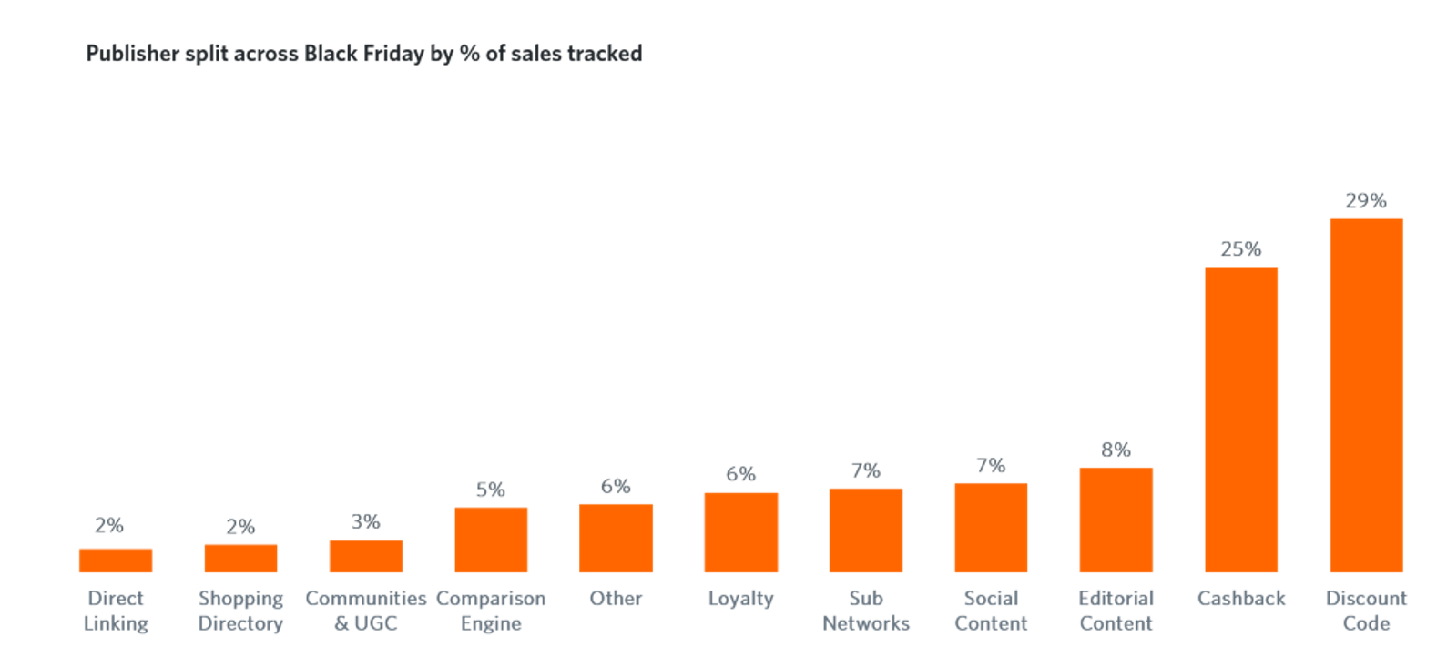 This graph shows the sales split across the top ten publishers by sales volume on Black Friday. Unsurprisingly given the nature of Black Friday, incentivised traffic in the form of vouchers, coupons and discounts emerge as the largest single publisher type at 29%. The growth over the years of influencer marketing in our channel has been well documented and this year saw that category pull in an impressive 7% of sales: