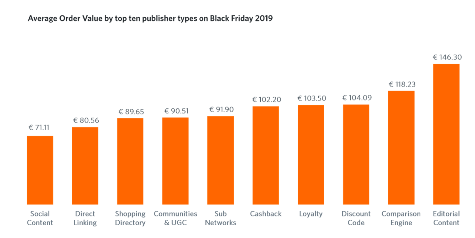 When considering which publisher type results in the highest average basket value, editorial underlines its credentials as one of the most important affiliate categories, pulling in almost €150 per sale, more than double that of social content, but potentially underlining how their strengths lie in targeting different brands and sectors:
