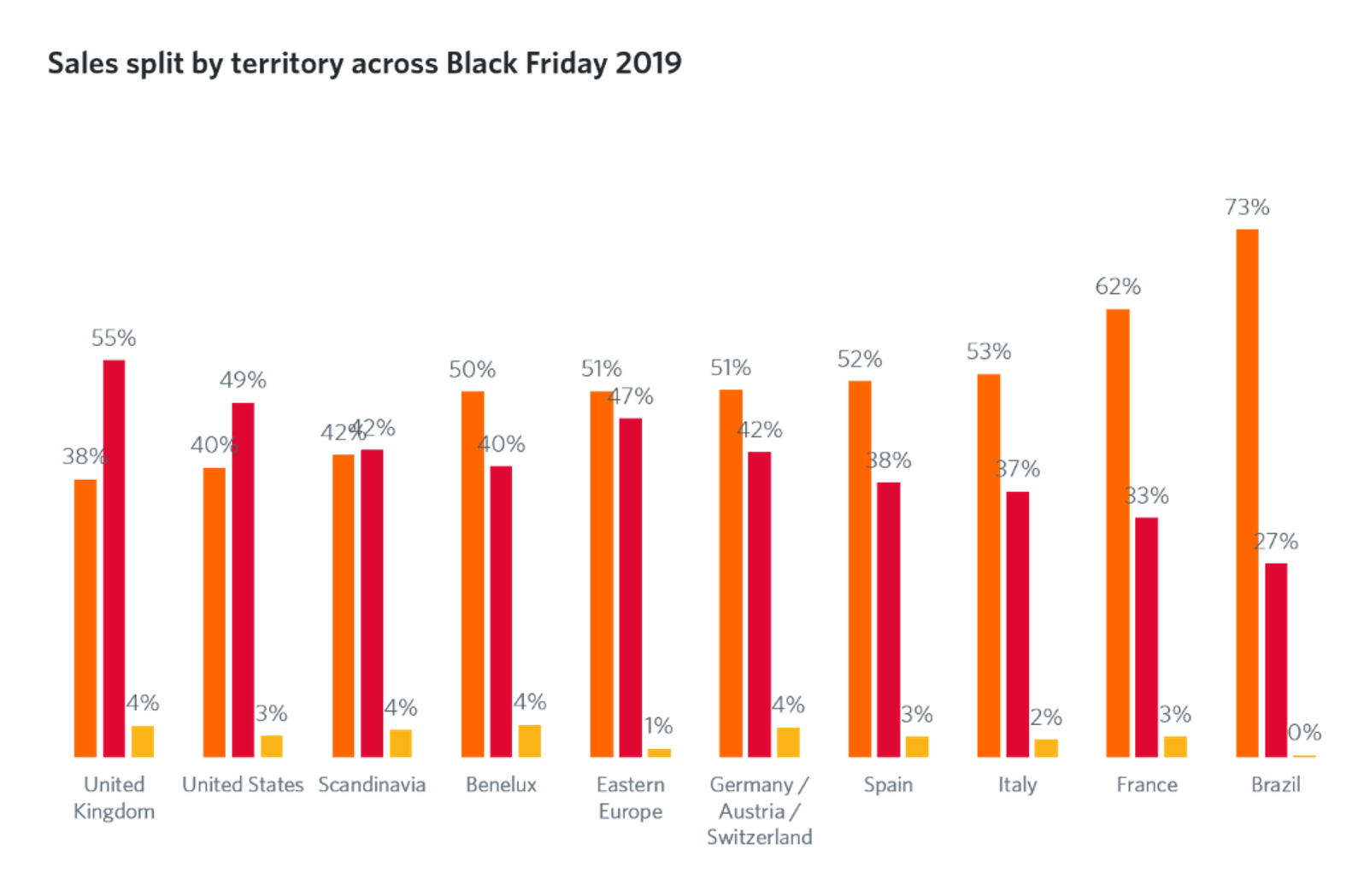 Yet again there were pronounced regional variations, with sales twice as likely to originate from a handset in the UK than Brazil.