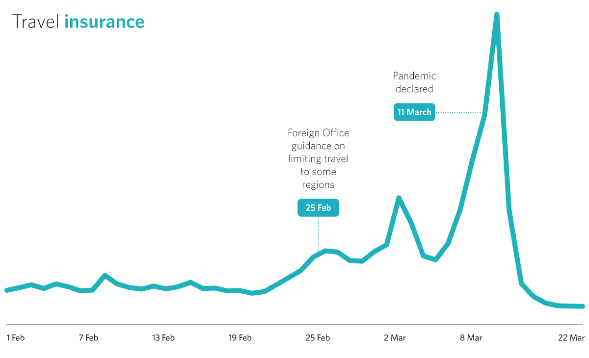 The first case of COVID-19 was reported to the World Health Organisation on New Year’s Eve 2019. However, once the virus spread to more countries governments started issuing more forceful advice against travel from the end of February. As a result the travel insurance sector saw a steady rise as consumers protected their upcoming bookings.