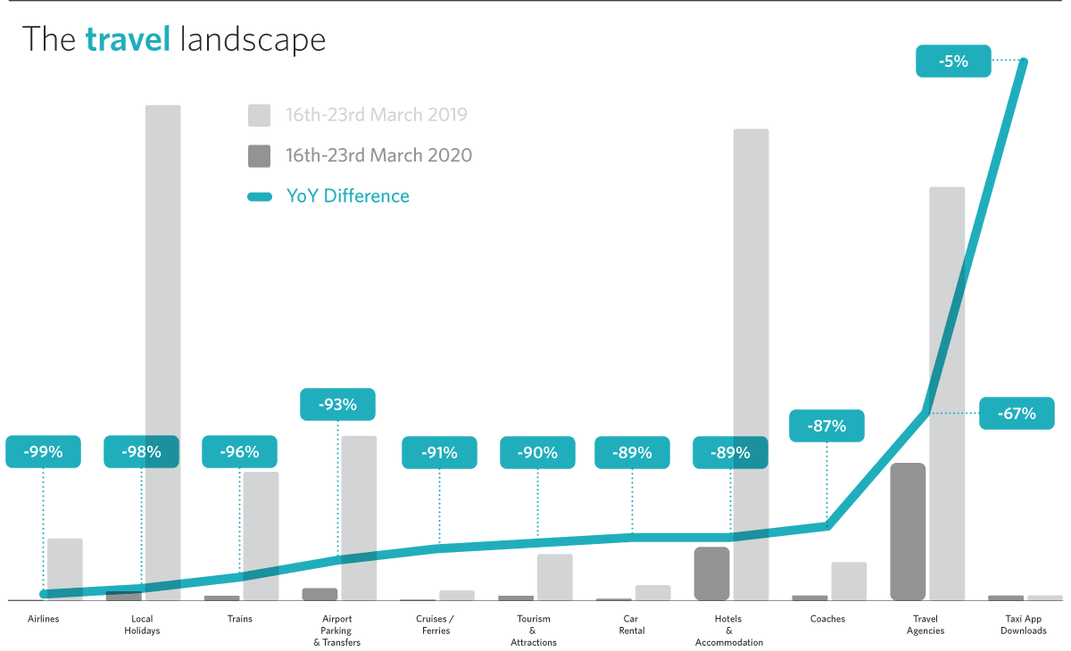 It will be no surprise for anyone to learn the whole travel sector has seen declines. Airlines and local holidays have taken the biggest hit down 98% on last year as consumers were asked to ‘refrain from all unnecessary travel’. Travel agencies and taxi application downloads have seen less of a decline, -67% and -5% retrospectively compared to the previous year.