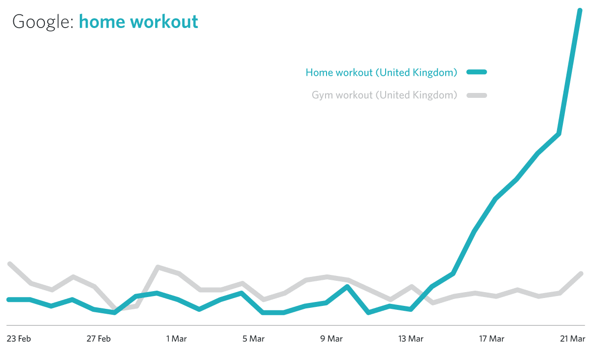 We have seen a surge in online content focused on supporting those staying at home who want to continue to work out as UK gyms are now shut, including The Body Coach, Joe Wicks who is running a live fitness class every morning at 9am on Instagram live in a bid to be the “nation’s P.E. teacher” as well as workouts tailored for seniors. Looking at Google search statistics in the UK we have seen a decline in ‘gym workout’ alongside a huge surge in searches for ‘home workout’. Queries for ‘home workout equipment’ specifically is up 90% versus the previous 30 days.