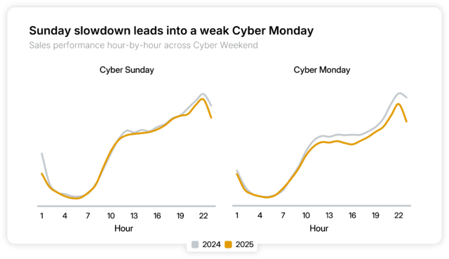 Then things slowed. On Sunday, the morning brought a relatively even set of readings before tapering off. By Cyber Monday, the gaps between 2024 and 2025 grew wider and wider, particularly around traditionally peak shopping hours like 9:00pm.