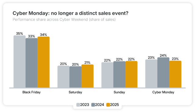 These mixed signals could fit the narrative of a sales event in transition. And at this crossroad, 2026 could bring anything from a more even spread of sales and less participation over Cyber Weekend to a dip in peak season discounting altogether.