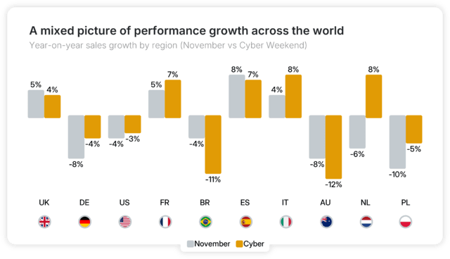 At the other end of the table, the US (-3%), Brazil (-11%), and Australia (-12%) all saw declines over Cyber Weekend, despite sales stabilizing a little more in November on the whole.