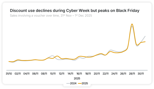 Fewer sales were being driven by discounts on Monday November 24, then Tuesday, then Wednesday. It took Black Friday itself to reverse the trend before discounts went back to having less of an impact vs 2024.