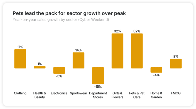 Pets and pet care was a big winner throughout November, reporting a +22% sales increase YoY. But it was the Cyber Weekend where it really shone – a +32% improvement matching or bettering efforts from established peak season players like gifts and flowers (+32%), sportswear (+14%) and clothing (+17%).