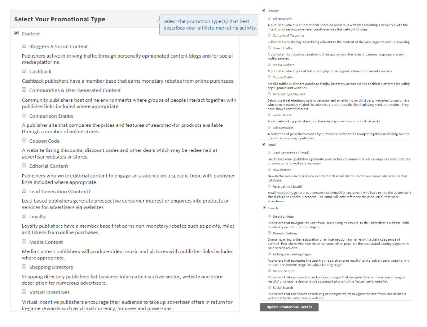 Adding a promotional type is important as it is an easy way for advertisers to identify what promotional methods you use. You may select as many promotional types as are applicable to you, and then set one as your primary promotional type. To add promotional types: