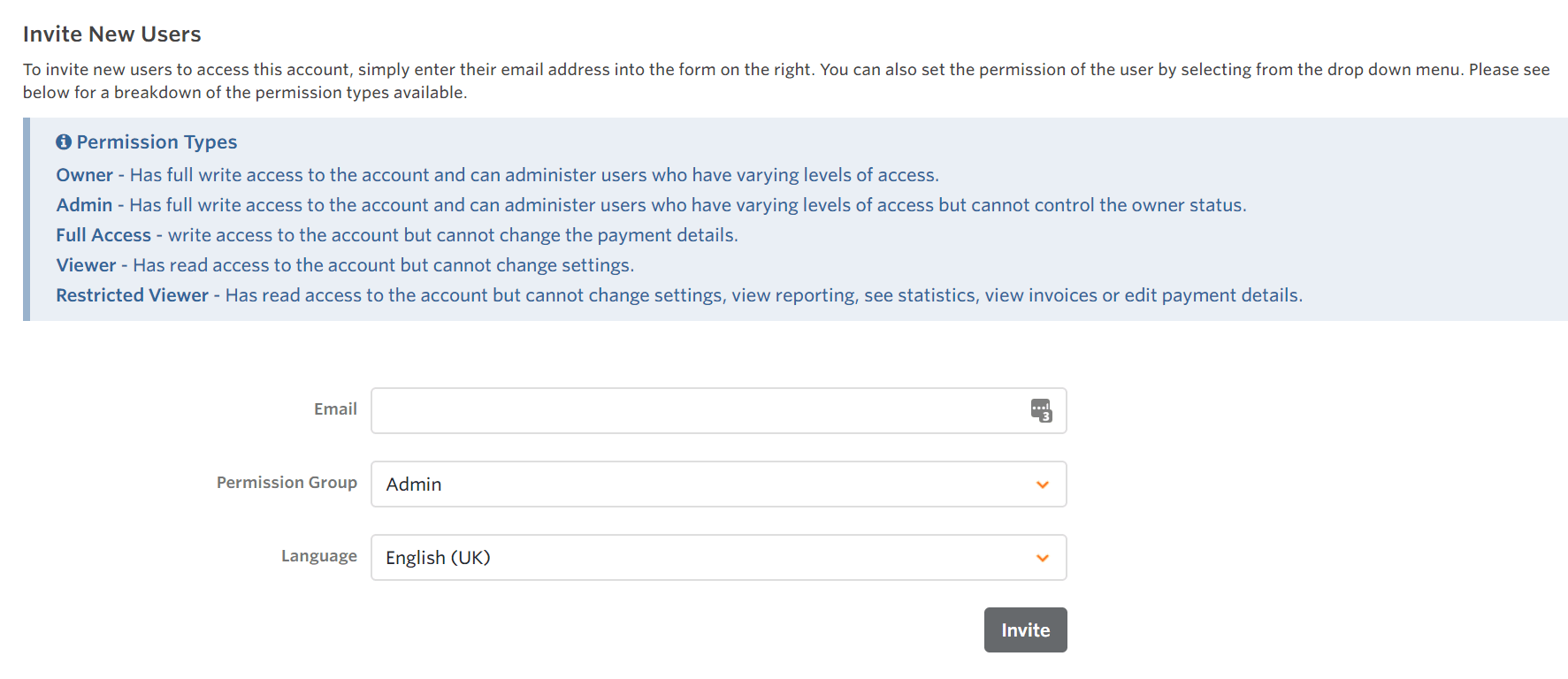 - Restricted Viewer - Has read access to the account but cannot change settings, view reporting, see statistics, view invoices or edit payment details.