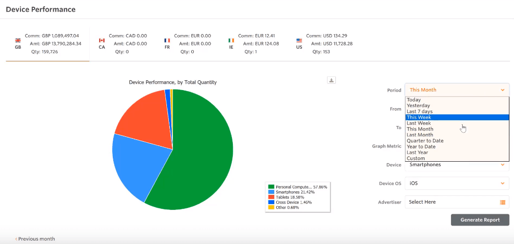 The main purpose of the Device Performance Report is to provide publishers with information about the specific devices used when a transaction has been made via their affiliate link. This report helps better understand user behaviour when purchasing through a publisher site and allows you to adapt your marketing efforts to connect with them via the device type they are mostly using. For example, if the vast majority of customers are using Smartphones, ensure that your site is easy to navigate on mobile.