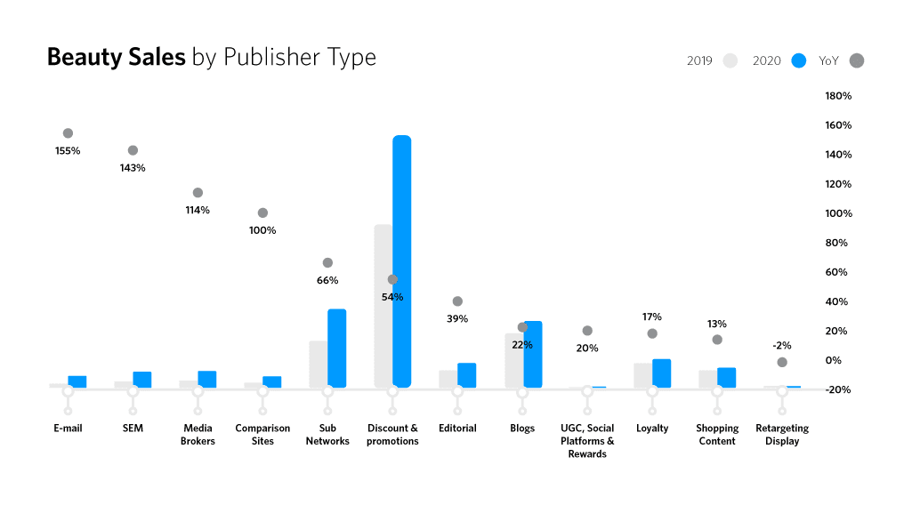 Whilst promotional publishers saw the largest number of sales, email and SEM (CSS) saw the largest year on year sales growth; up +155% and +143% respectively. Sub-networks, the second biggest sector, saw a +66% increase in sales year on year, followed by blogs taking the third slot in terms of volume, up +22% on 2019.