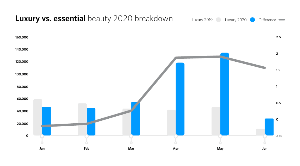 Our theory therefore does just about seem to play out in the numbers – the difference in the most recent data since the lockdown easing announcements wasn’t as stark as we would have predicted, but luxury beauty products and brands have seen an increase in more recent weeks with the easing of lockdown, but have seen strong growth throughout COVID-19 when comparing YoY.