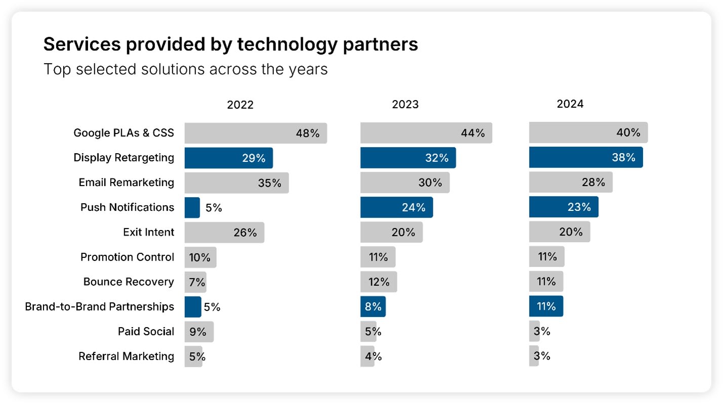For example, Display Retargeting is now offered by 38% of tech partners having grown by 31% since 2022. Push Notifications and Brand-to-Brand Partnerships are also high-growth areas, having seen increases of 360% and 120% respectively over the same period.