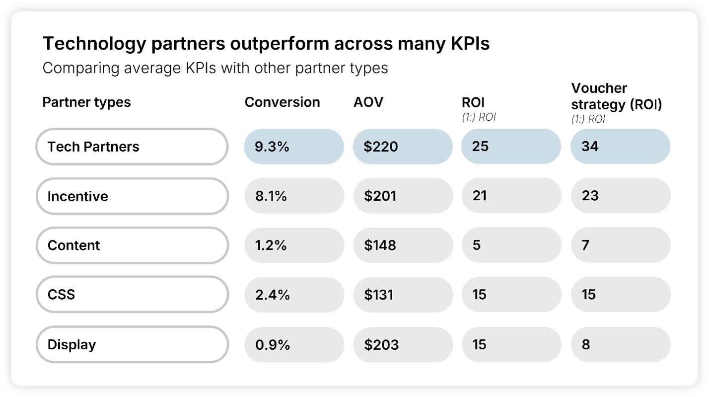 We’ll wrap things up by looking at ROI. Most tech partners are free to launch and tend to operate on a cost-per-acquisition (CPA) basis. That cost-effective implementation, combined with their results, could explain why their return on investment sits at 25:1, above incentive publishers on 21:1, CSS on 15:1, and content on 5:1.