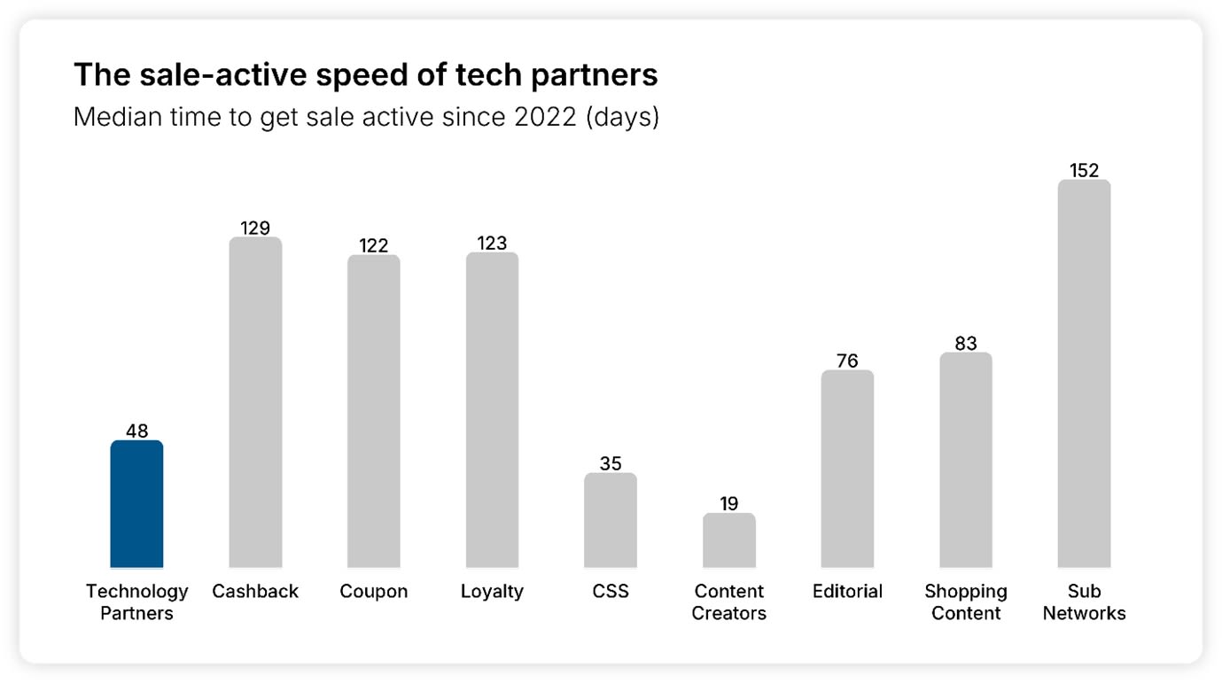 Judging by two years of activations, it takes just 48 days for tech partners to become sale active. By comparison, cashback, coupon, loyalty, and sub-networks all take over 100 days to reach the same status.
